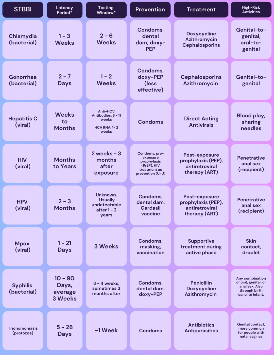 *Testing Window: This refers to the period of time between the onset of an infection and when it is detectable on a test. For HIV in particular, the window period varies significantly. Routine testing (every 3-6 months) can help offer results with more certainty.